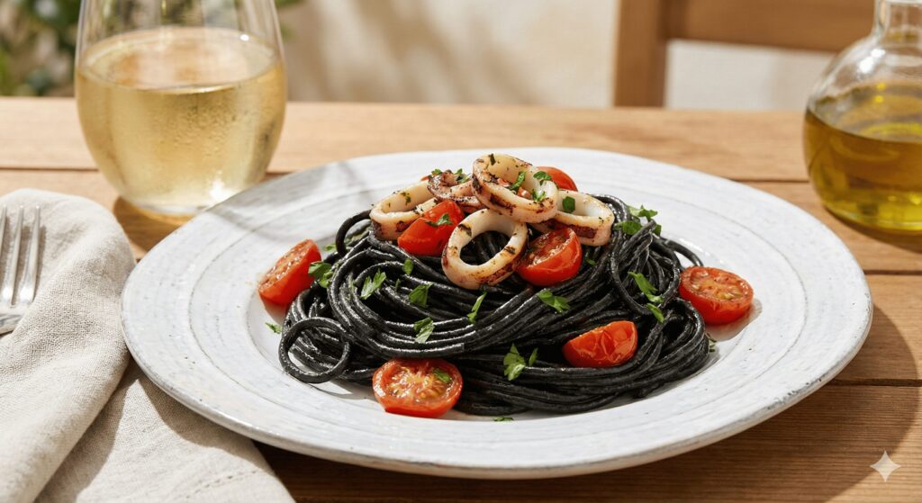 イタリア料理の「イカ墨パスタ(スパゲッティ・アル・ネロ・ディ・セッピア)」は、世界的に有名な料理です。真っ黒なパスタは見た目のインパクトも抜群ですが、その味わいも独特です。海の香りと、ほのかな甘み、そして深いコク——イカ墨は単なる色付けではなく、料理に複雑な風味をもたらします。