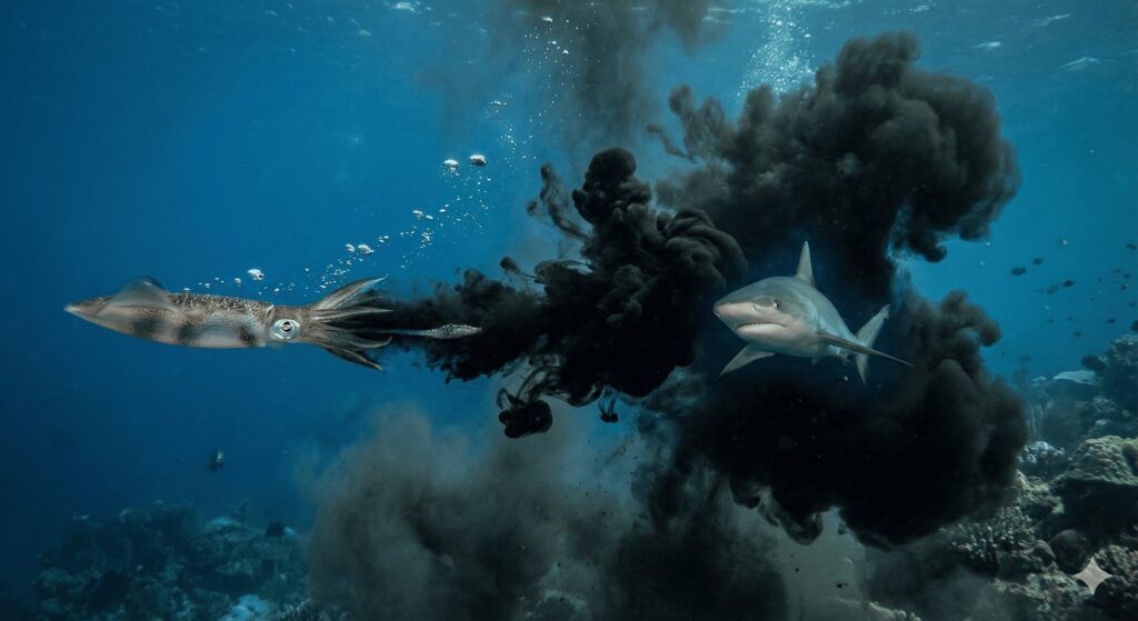 この煙幕は想像以上に効果的です。イカの墨は水中で素早く拡散し、数秒で周囲数メートルを真っ黒に染めます。捕食者であるサメや大型魚は、視覚に大きく依存して狩りをします。その視界が突然奪われれば、どこに獲物が逃げたのかわからなくなります。