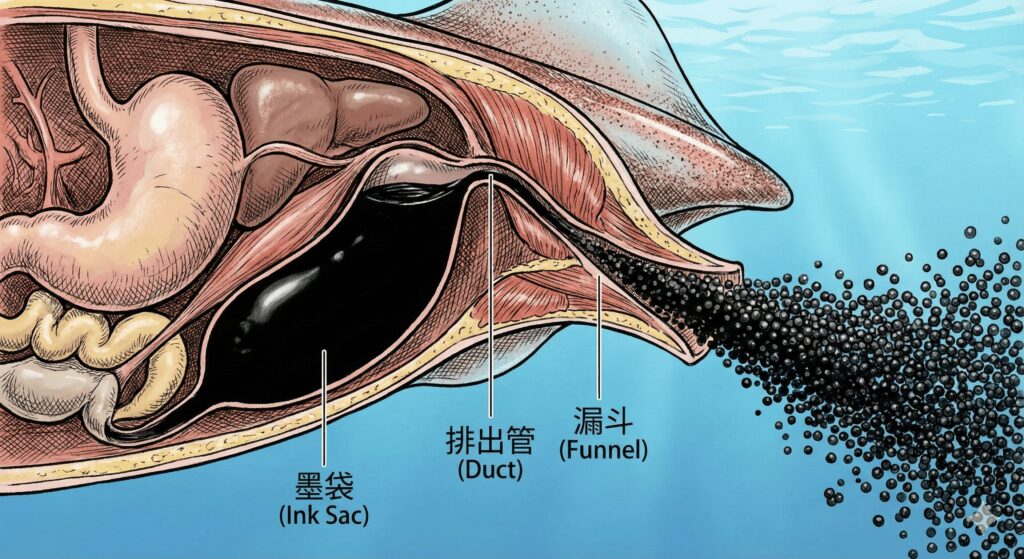 では、この墨はどうやって外に出るのでしょうか?実は、イカの体には巧妙な排出システムが備わっています。墨袋から伸びる細い管が、イカの排泄口(肛門)の近くにある「漏斗(ろうと)」と呼ばれる器官につながっています。